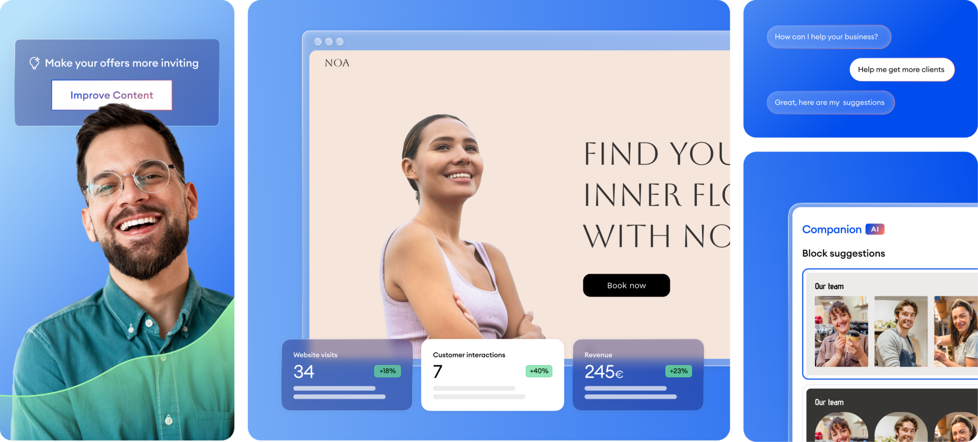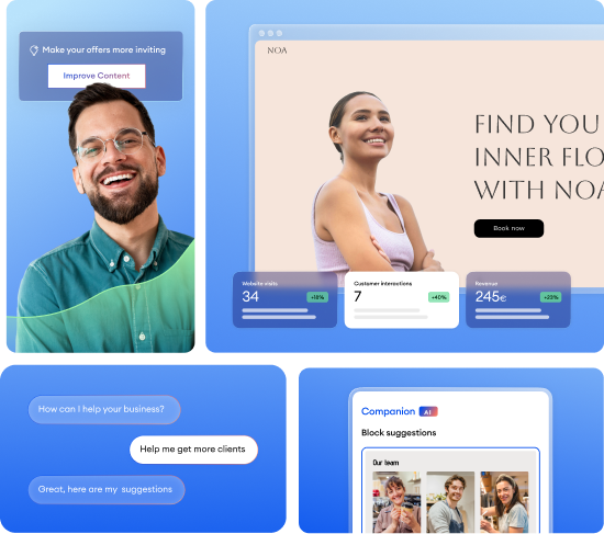 Jimdo combines everything your business needs – website, marketing, bookings, or an online store. With Companion, you get a smart assistant that thinks along with you: it understands your business, shows you what to do next, and helps you make it happen. For more visibility, more customers, and a busier calendar.