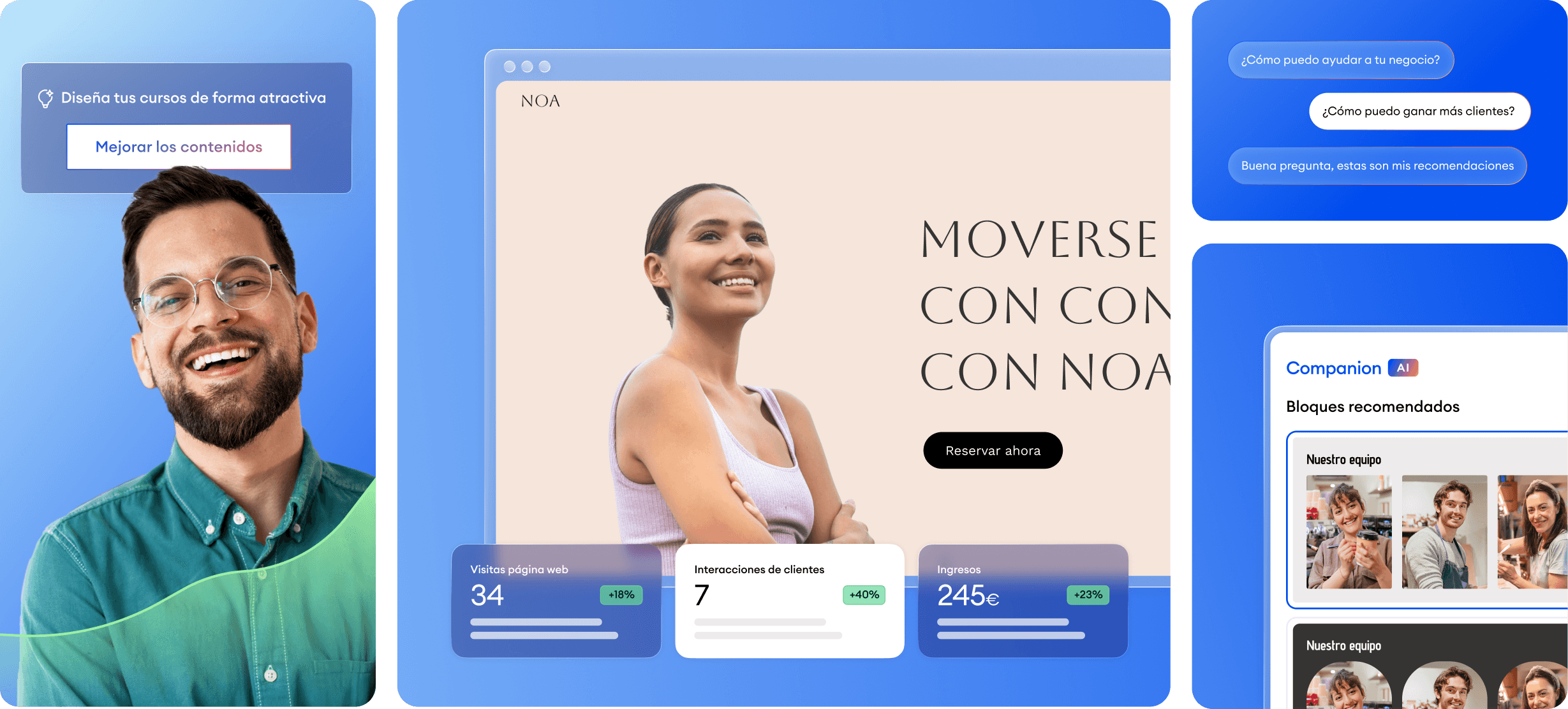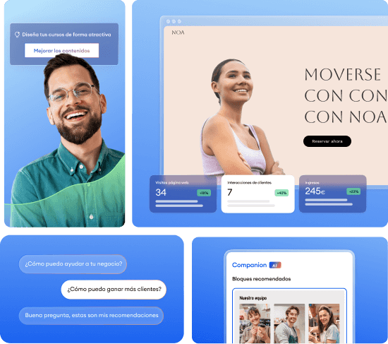 Jimdo combina todo lo que tu negocio necesita: página web, marketing, herramienta de reservas, tienda online… Con Companion, tendrás un asistente que piensa contigo: entiende tu negocio, te indica qué hacer y te ayuda a materializarlo. Más visibilidad, más clientes y una agenda llena.